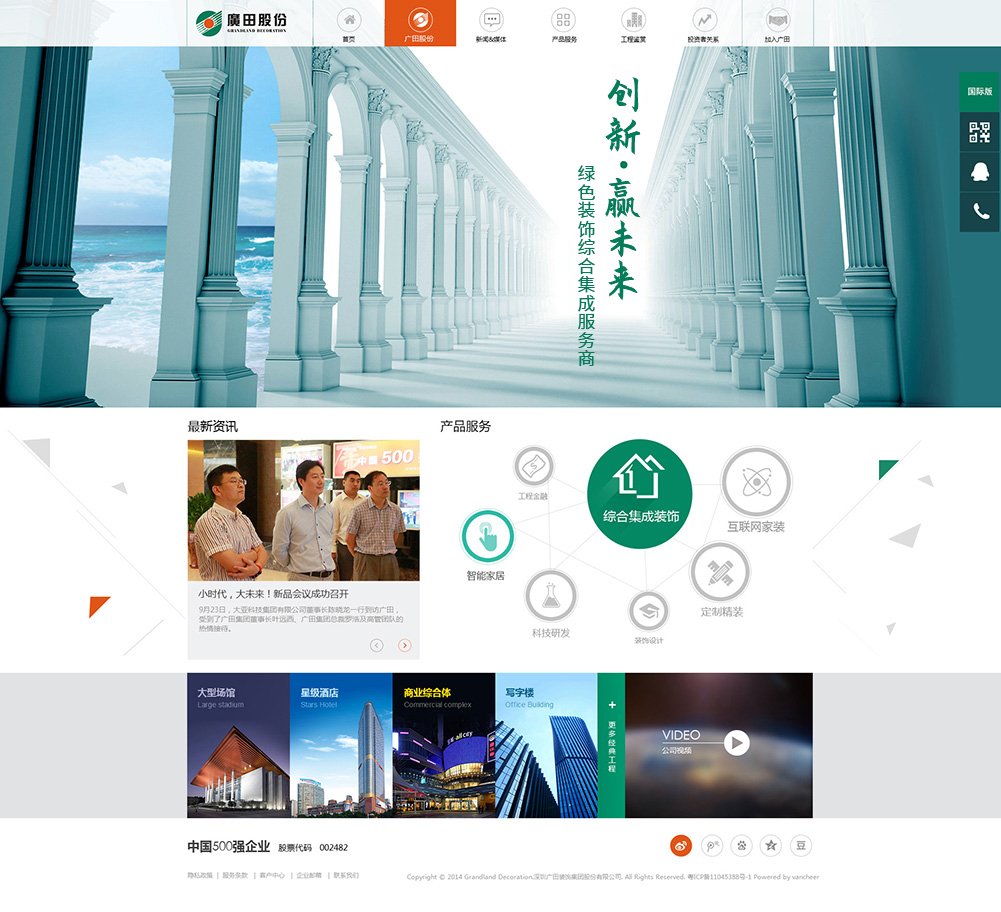 廣田集團(tuán)成立于1995年,是一家以建筑裝飾設(shè)計(jì)與施工,綠色建材研發(fā)與生產(chǎn)為主體的專業(yè)化、綜合性上市集團(tuán)企業(yè)(股票代碼:002482)。公司連續(xù)兩年榮膺《財(cái)富》中國(guó)500強(qiáng)企業(yè)。